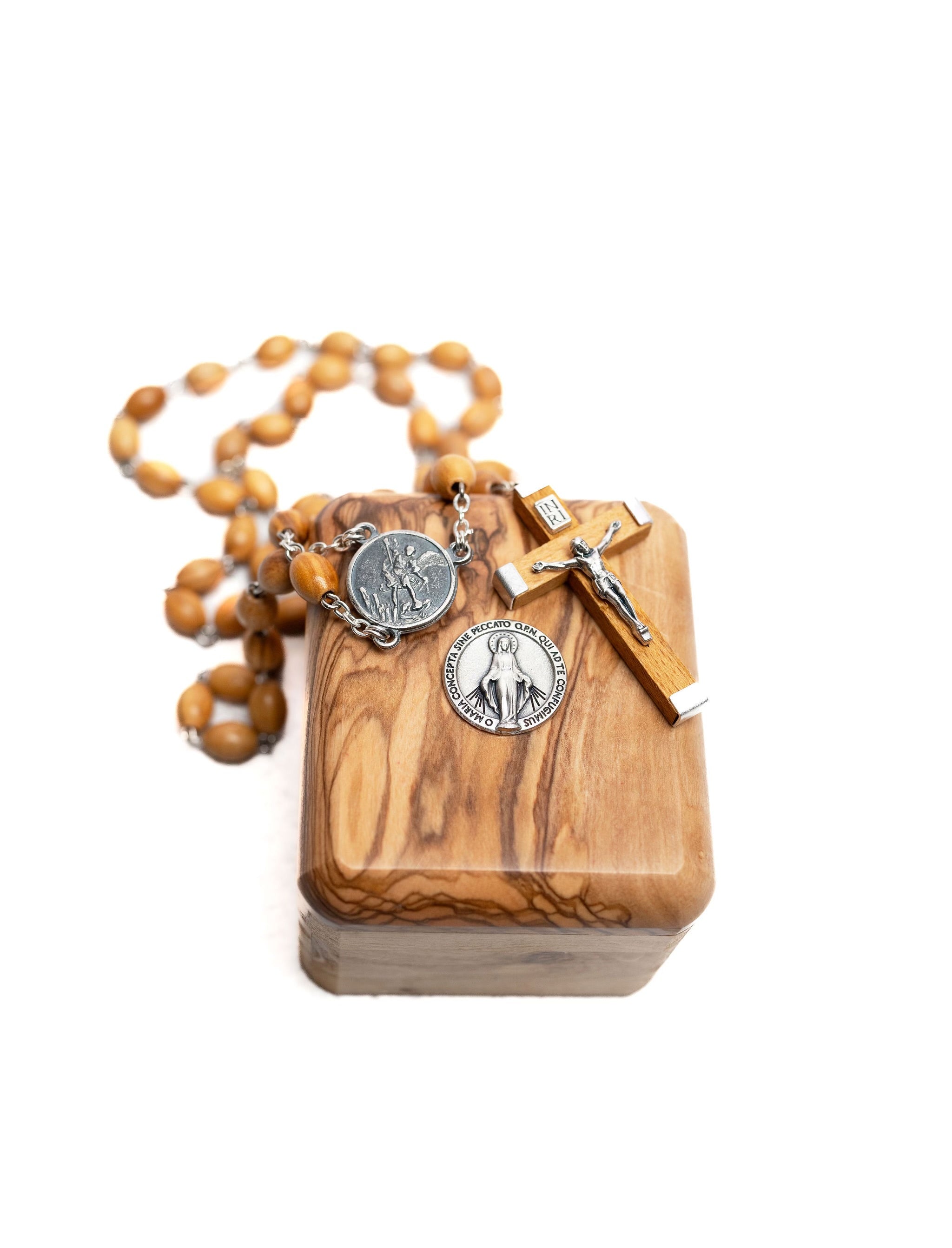 All of our Bethlehem Olive Wood Crosses come in a gift box, except the key chain and the rosary which come in a satin bag.