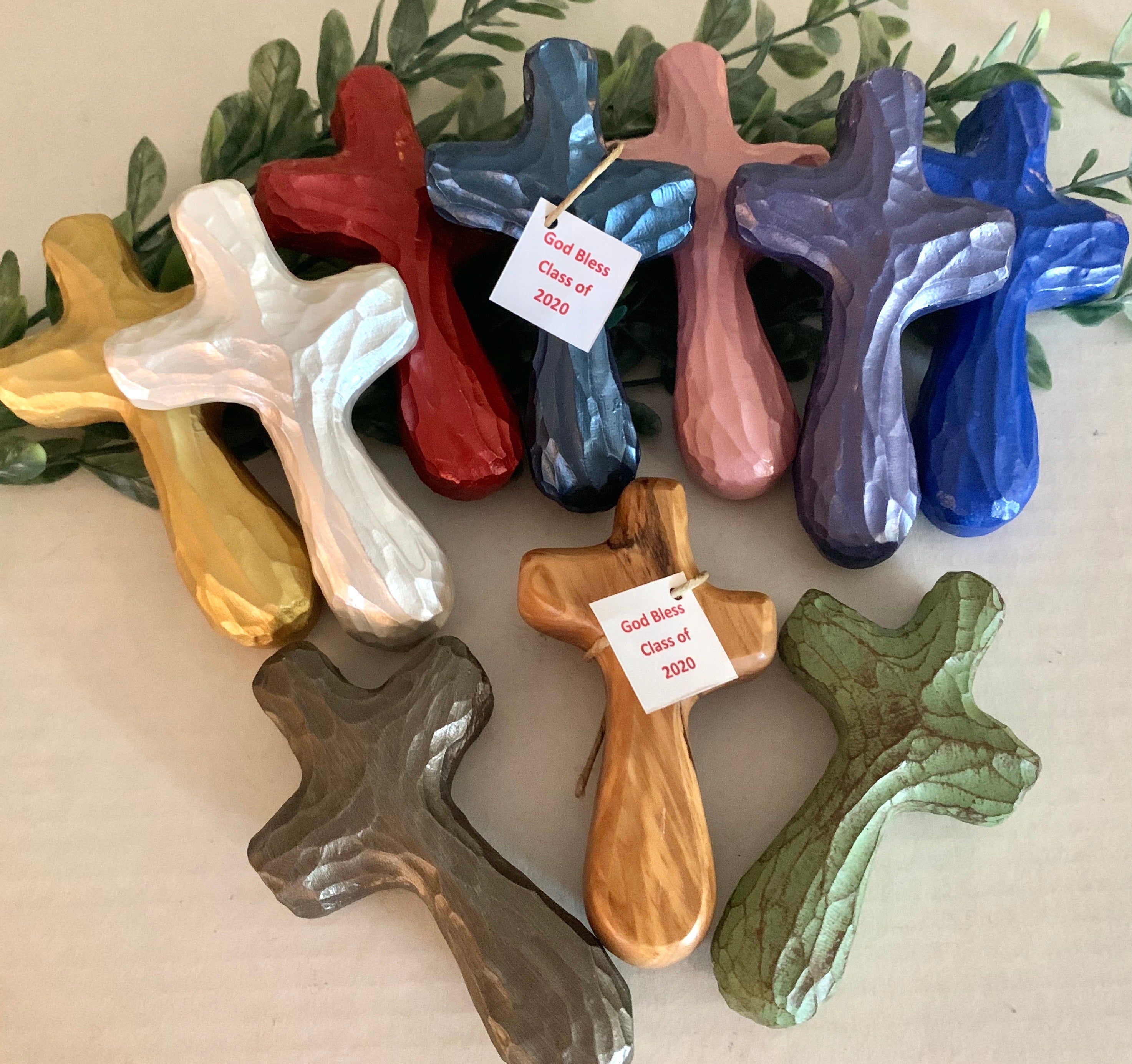 Our Bethlehem Olive Wood crosses are made from certified genuine Bethlehem Olive Wood in the Holy Land. These crosses range in size, but are all designed to fit in the palm of your hand.