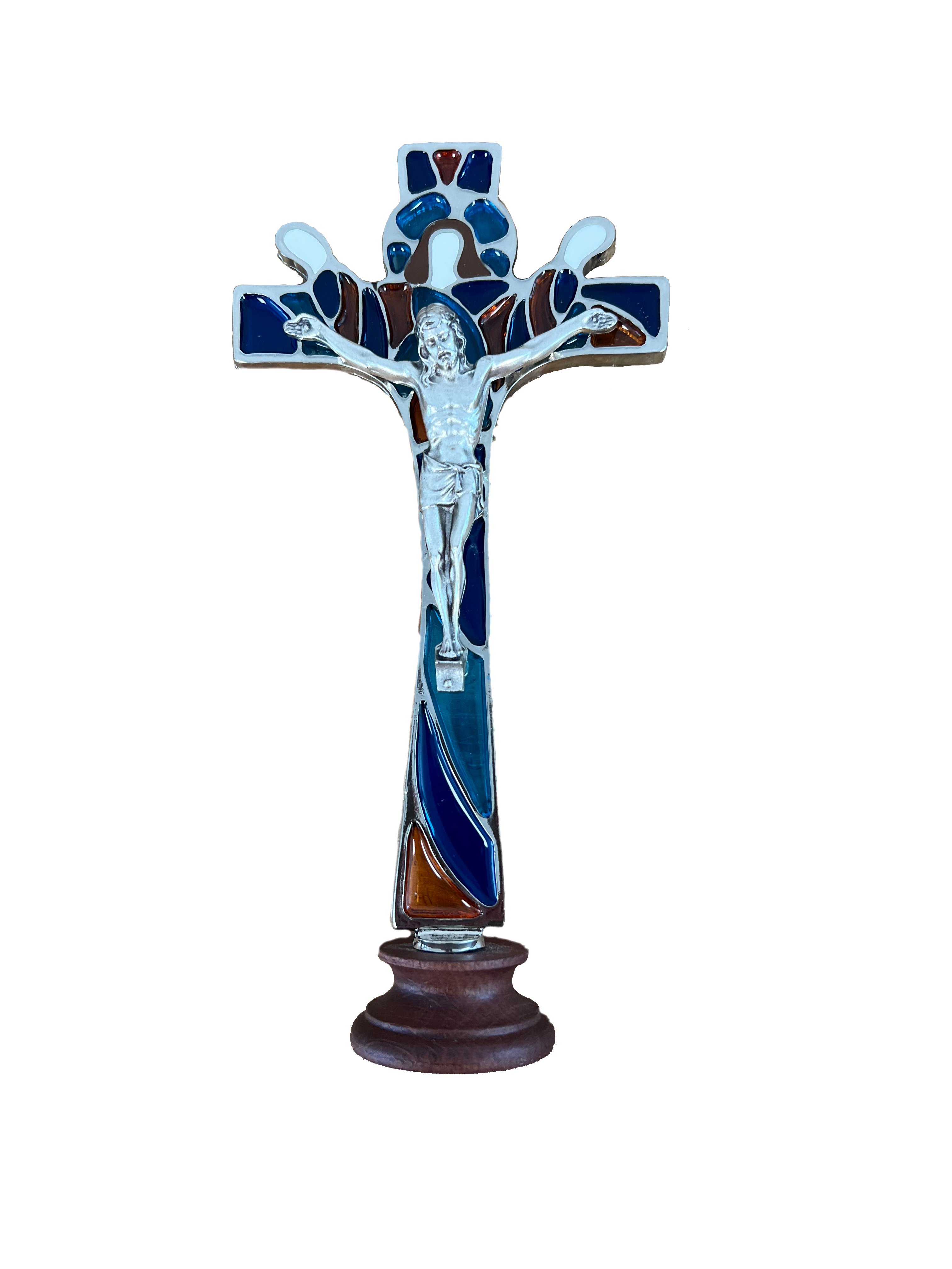 This multi colored enamel God the Father cross has a silver tone corpus and is imported from Italy.