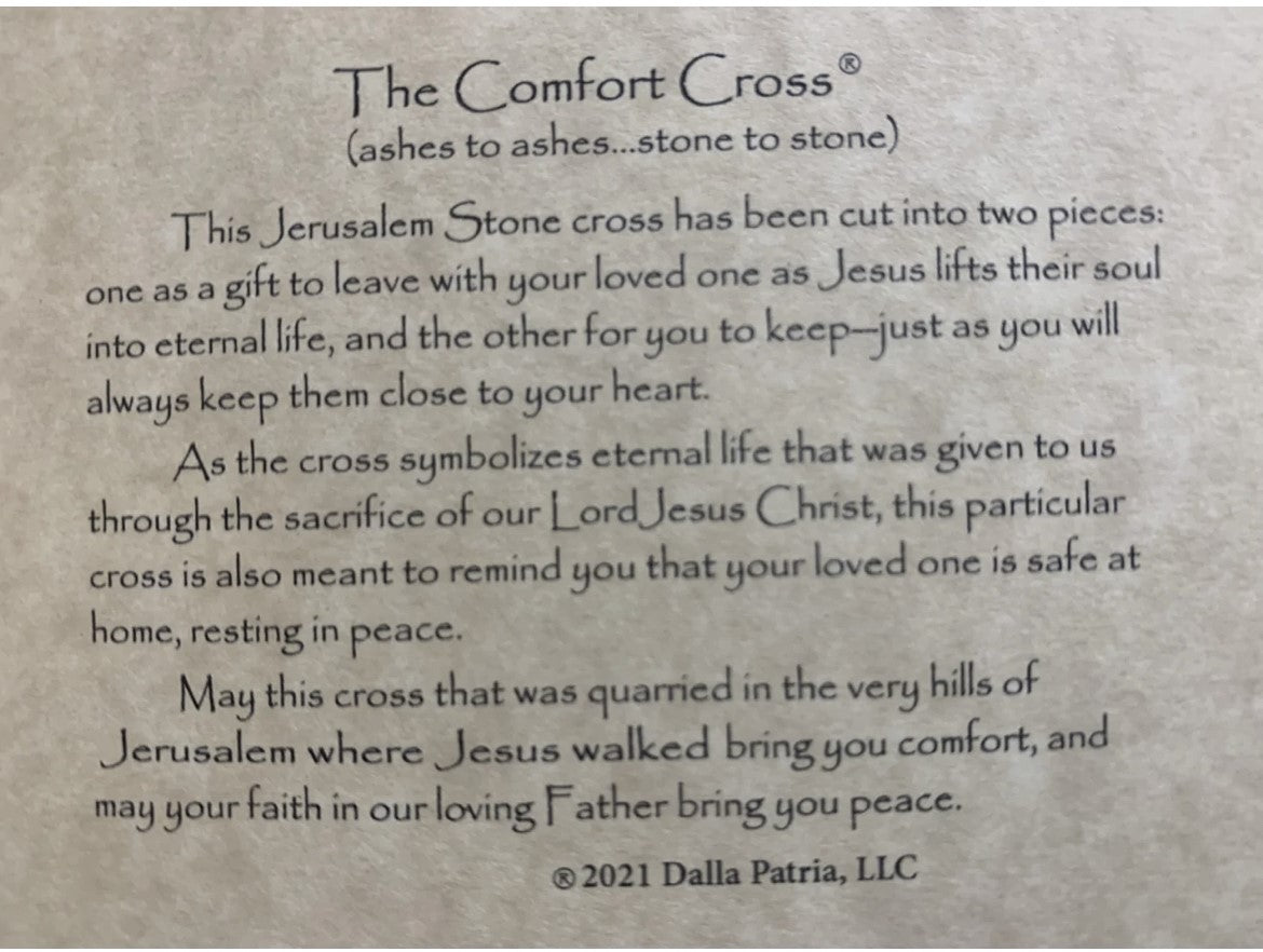 Stay connected with your loved ones, no matter how far they may be, with the "Jerusalem Stone Comfort Cross." Celebrate the strength of love and the unbreakable bond that bridges the physical distance, and cherish the sentimental value of this set with its satin gift bag and certificate of authenticity, making it an even more remarkable gift to treasure.