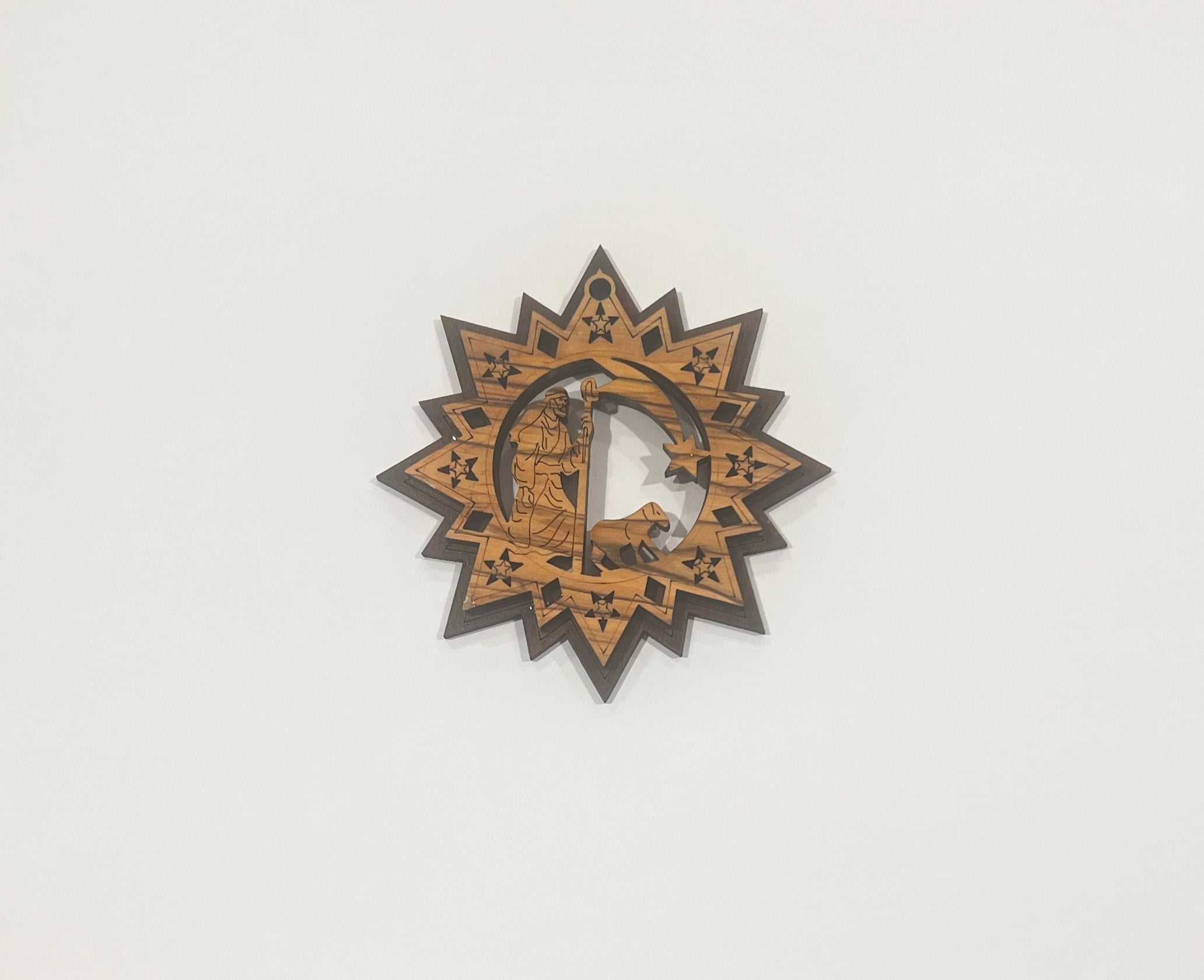 Made from Authentic Bethlehem Olive Wood. This hand-crafted ornament depicts the Shepherd and his lamb and is a great reminder of the true reason for the season. Measures 3.5" x 3.5".