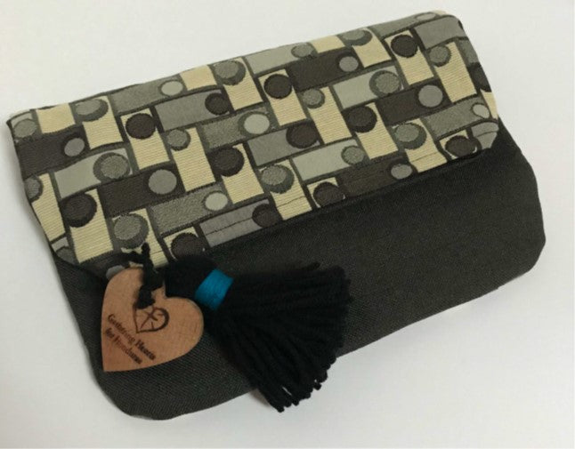 Versatile clutch bag is reversible by just flipping the top over to the other side. Each bag includes a pompom coordinating to the color of the bag. Suitable for an iPad or tablet protector. Mini's fit well inside when the bag is used as a clutch; full-sized tablets fit inside when used in full form and flat.