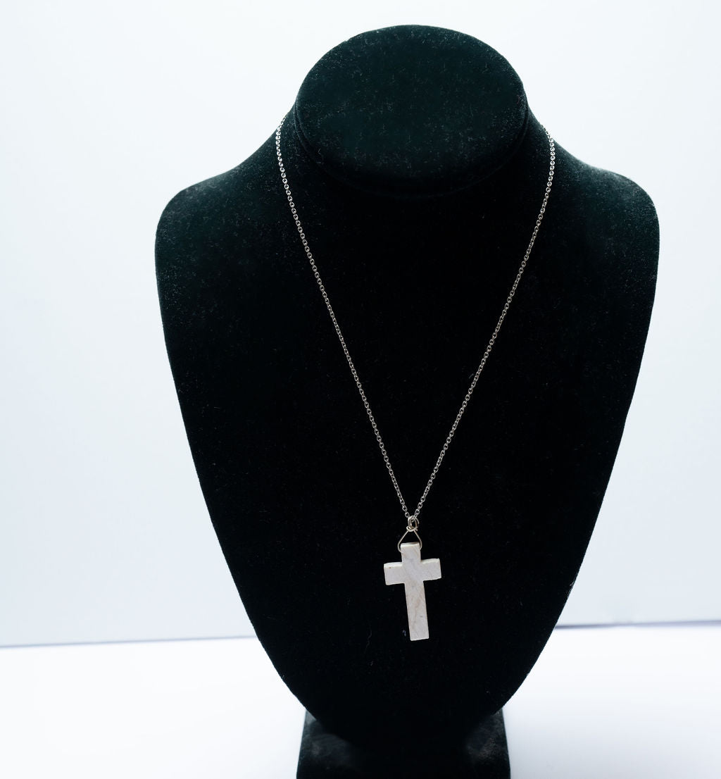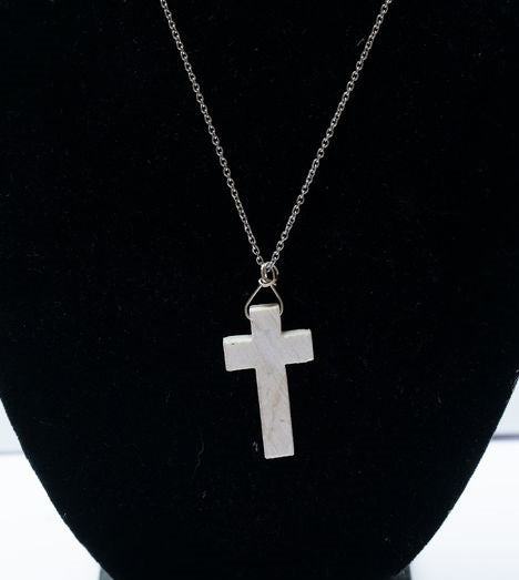 This Jerusalem Stone cross necklace come on a 18" sterling silver chain with rhodium finish. The cross is made from authentic Jerusalem stone that is imported from the Holy Land and measures 5/8" by 1 1/8".