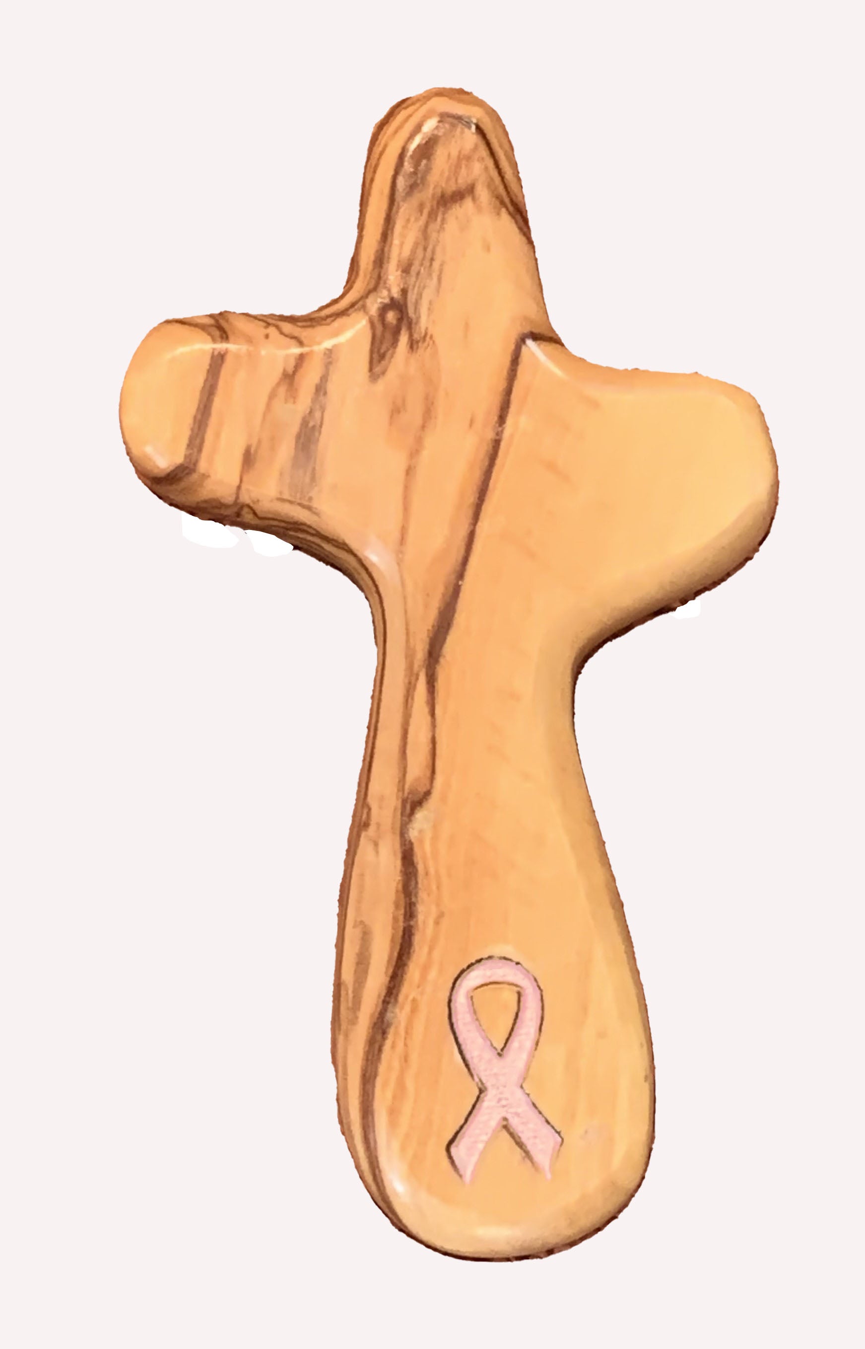 For Breast Cancer month, we have taken our most popular large holding cross and laser engraved the pink breast cancer ribbon into the bottom of the cross. The cross is 4" high and 3" wide and designed to fit into the palm of your hand.