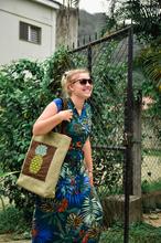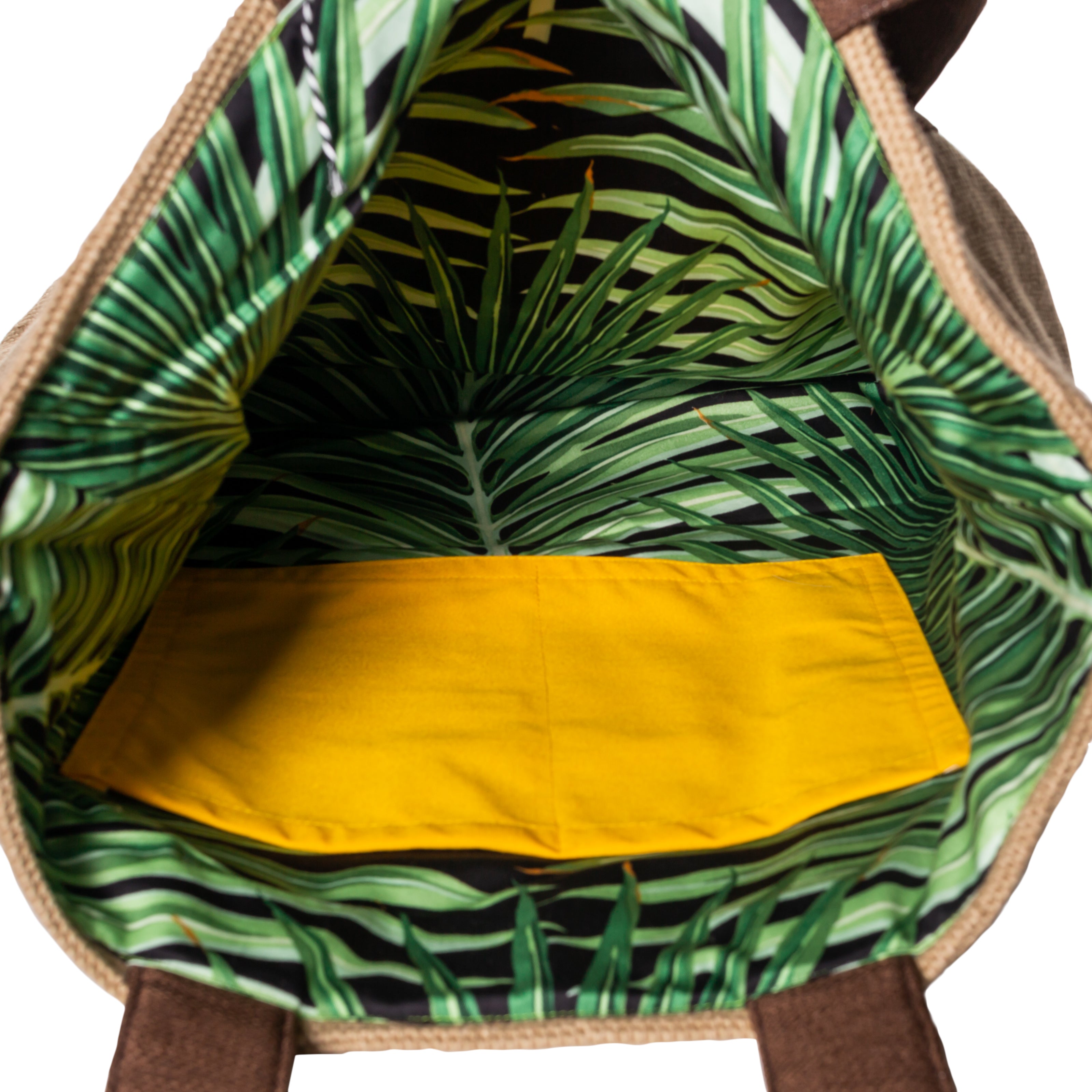 Made of refined and soft burlap, each Piña Pocket bag is entirely unique. Each pineapple is hand embroidered then applied to the bag. The lining is printed polished cotton featuring palm fronds.
