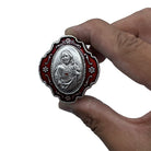 Cube shape beads Rosary with silver finish links, red enameled Sacred Heart of Jesus metal Our Father beads, Sacred Heart of Jesus center and a red enameled Crucifix. The Rosary Gift set comes with an oval metal box with a red enameled lid along with a Sacred Heart of Jesus image. Both the rosary and the box are made of metal and are very sturdy. It is Suitable for Men, Teens and Older Kids. Made in Italy.