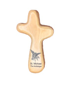 Our Saint Michael the Archangel holding cross takes our largest holding cross and laser engraves a picture of Saint Michael the Archangel on the bottom of the cross. The cross is 4" by 2" and is made to fit in your hand. Hand crafted out of Bethlehem Olive Wood in the Holy Land, this cross comes with a Saint Michael the Archangel prayer card.