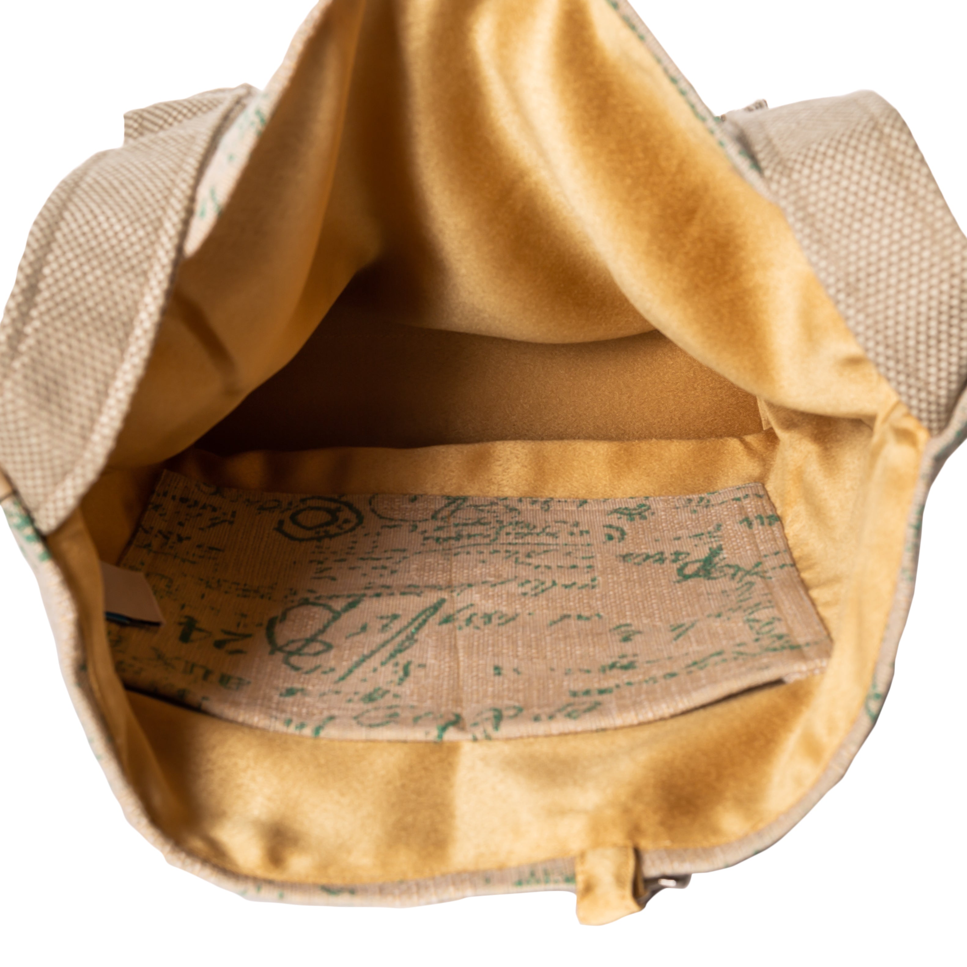 Handbag is 12" x 14" x 4"; cross-body strap is 44" in length. Inside double pocket is 9" x 6-1/2". Hook/ring closure.